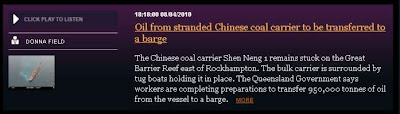ABC News Online, 4 April: not yet found an oil leak. (Chinese coal ship runs aground off Queensland)Still, a bit of an improvement on previous efforts...From the vault - f-oiled again.